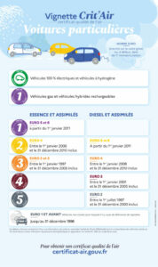 On trouve 6 classes environnementales. Les véhicules sont classés suivant les critères suivants : motorisation du véhicule, type de véhicule et norme Euro. Il existe cependant des cas particuliers comme les voitures électriques et hydrogènes qui n’émettent pas de gaz à effet de serre. Ces dernières sont dotées d’un certificat de couleur verte.
