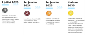 - Janvier 2024 : Crit'Air 4 (période de pédagogie pour les Crit'Air 3, pas de sanctions)
