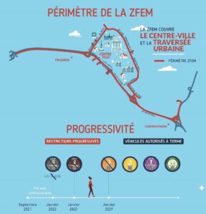 Depuis le 7 juillet 2023, une ZFE est mise en place dans 13 communes de la métropole grenobloise sur 49 pour les voitures particulières et deux-roues motorisés du lundi au vendredi, de 7h à 19h. Une adaptation de six mois est prévue à partir de chaque interdiction. Pendant cette période, aucune amende ne sera délivrée. La ZFE sera mise en place dans 13 communes de la métropole grenobloise : Échirolles, Eybens, Fontaine, Gières, Grenoble, La Tronche, Le Pont-de-Claix, Meylan, Saint-Égrève, Saint-Martin-d’Hères, Saint-Martin-le-Vinoux, Seyssinet-Pariset et Seyssins.