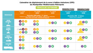La ZFE de Montpellier Méditerranée Métropole est entrée en vigueur le 1ᵉʳ juillet 2022 avec des restrictions pour les poids lourds ou les utilitaires. Depuis le 1ᵉʳ janvier 2023, les voitures particulières sont concernées. Les restrictions s'appliquent 7j/7 et 24h/24. Entre le 1ᵉʳ juillet 2022 et le 30 juin 2023, 11 communes de la métropole sont concernées par la ZFE : Castelnau-le-Lez, Clapiers, Grabels, Jacou, Juvignac, Lattes, Le Crès, Montpellier, Pérols, Saint-Jean-de-Védas et Villeneuve-lès-Maguelone. Au 1ᵉʳ juillet 2026, les 20 communes de la métropole restantes intègreront la ZFE.